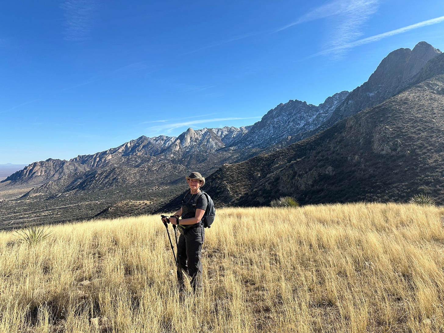 Like Chisos Basin, we keep returning here. There’s just something about the desert mountains that draws us back. Two stunning hikes begin at this camping area: the Pine Tree Loop and the Baylor Pass Trail. This year we began with the Pine Tree Loop, a trail that meanders through strands of alligator juniper, piñon pine and the remains of ancient ironwood trees; silver-gray sentinels bleached by the sun. The loop still had the remains of a recent snow on the north faces of the path. Baylor Pass was covered with golden grasses that shimmered against blue skies and mountain peaks.