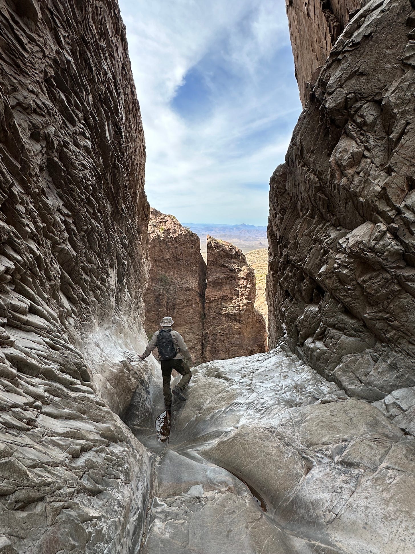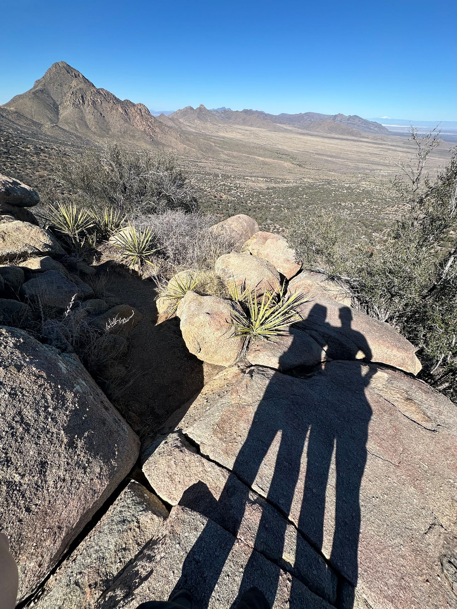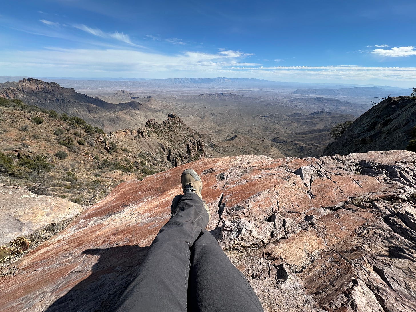 This was our third time in Chisos Basin. When we arrived at the campground, which is usually full, it was oddly deserted. We learned from the ranger that a drought taken hold, severe enough to shutter the entire lodge and all of the campground bathrooms in order to conserve water. For us? No water, no worries. We are self contained and had filled up with water before we made the 110 mile drive into the campground. The benefit of the drought was that trails were empty and as quiet as we had ever seen them. In our all-day hike to the South Rim, we encountered only one other hiker who shared that the East Rim (which had been closed when we had been here in prior years because of nesting peregrine falcons) was actually open. We took it as serendipitous news and decided to take the East rim to South Rim trail. It added an additional four miles to our twelve mile loop, but it was worth every extra step. We ate lunch on the East Rim. It was probably the most stunning place we’ve ever eaten PB&J sandwiches.