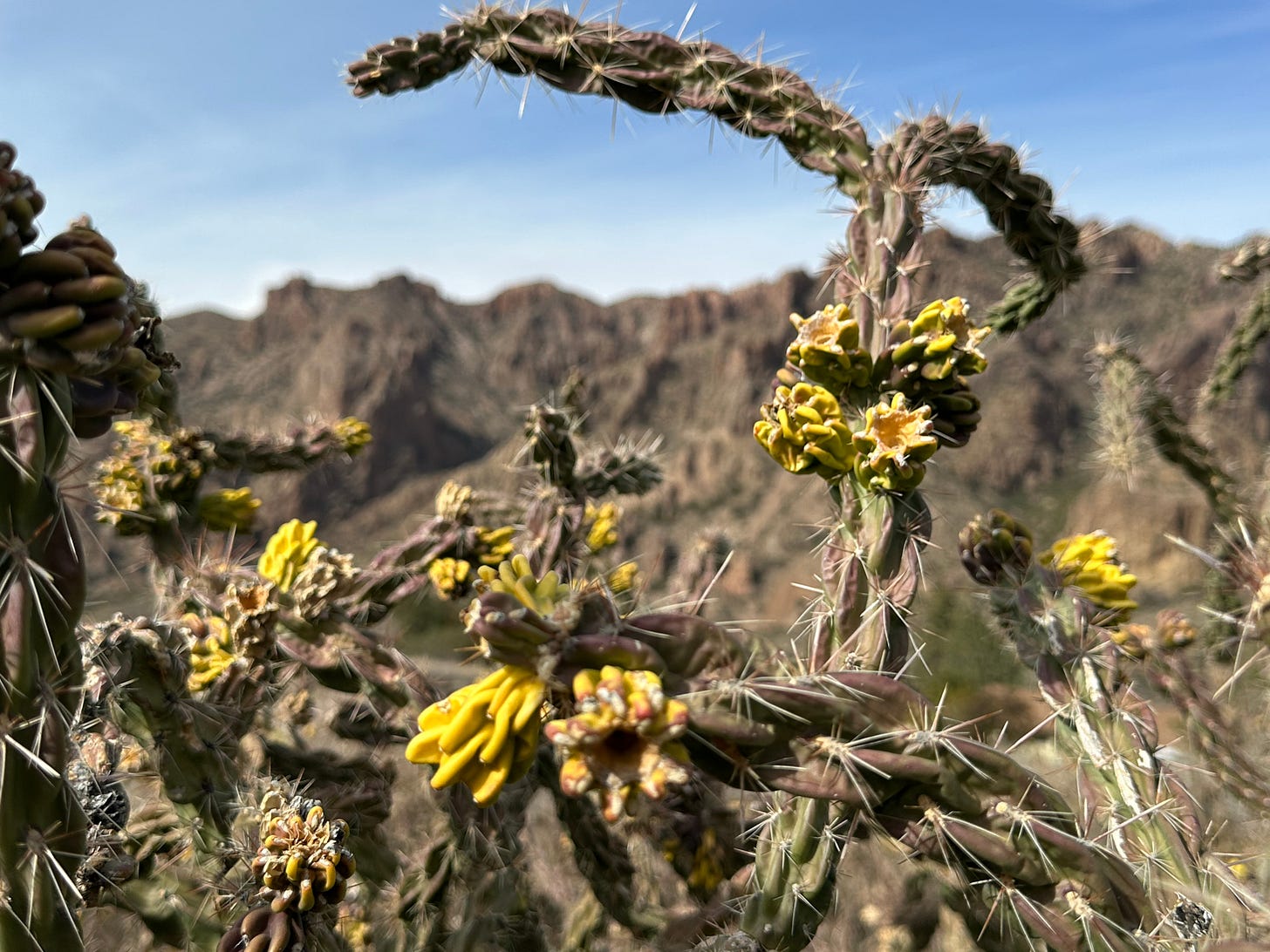 We spent three nights in camping and hiking in the Chisos Basin, unwinding and easing into a different slower, more thoughtful rhythm. I can tell when this begins to happen. I tune in and notice small things; A bright blue Texas Jay alerted to our presence, calling to their mate. The Cholla cactuses in bloom. A small desert flower growing in a crack of rocks. The waning sun, casting deep shadows on the burnt orange hills. Orion’s Belt, now bright enough to see his scabbard, moving across the night sky.